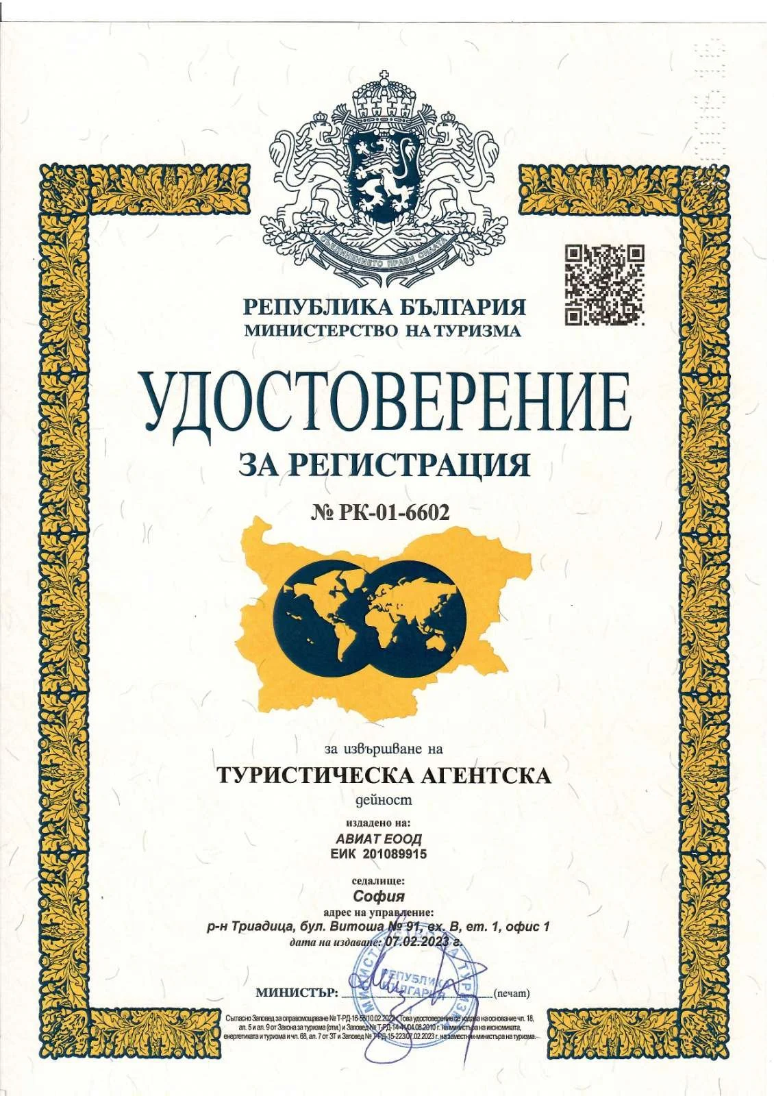 AVIAT Ltd. tourist agency has been carrying out tourist activities with a license from the Ministry of Tourism in Bulgaria since 2014.